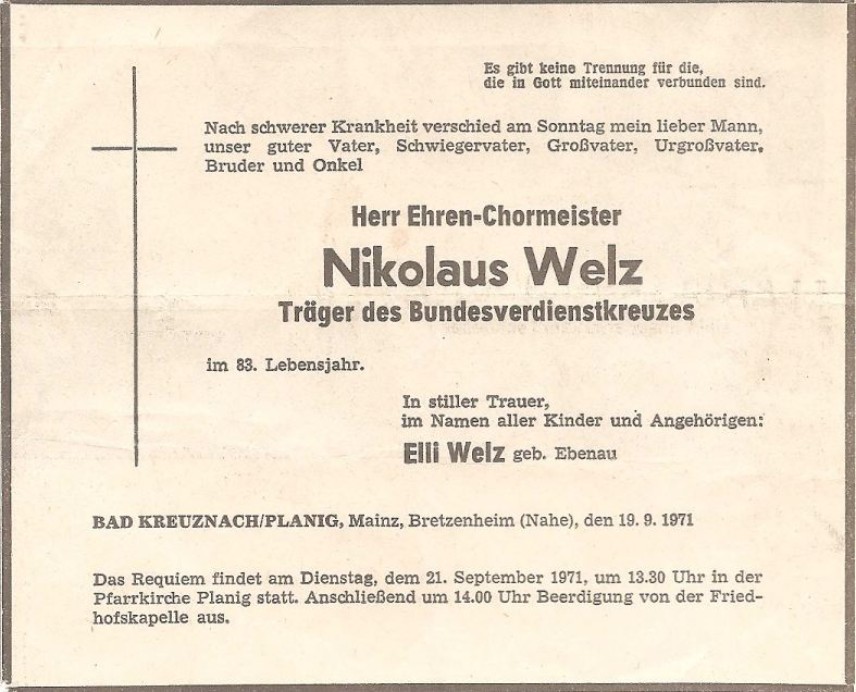Nikolaus Welz Ehren - Chormeister